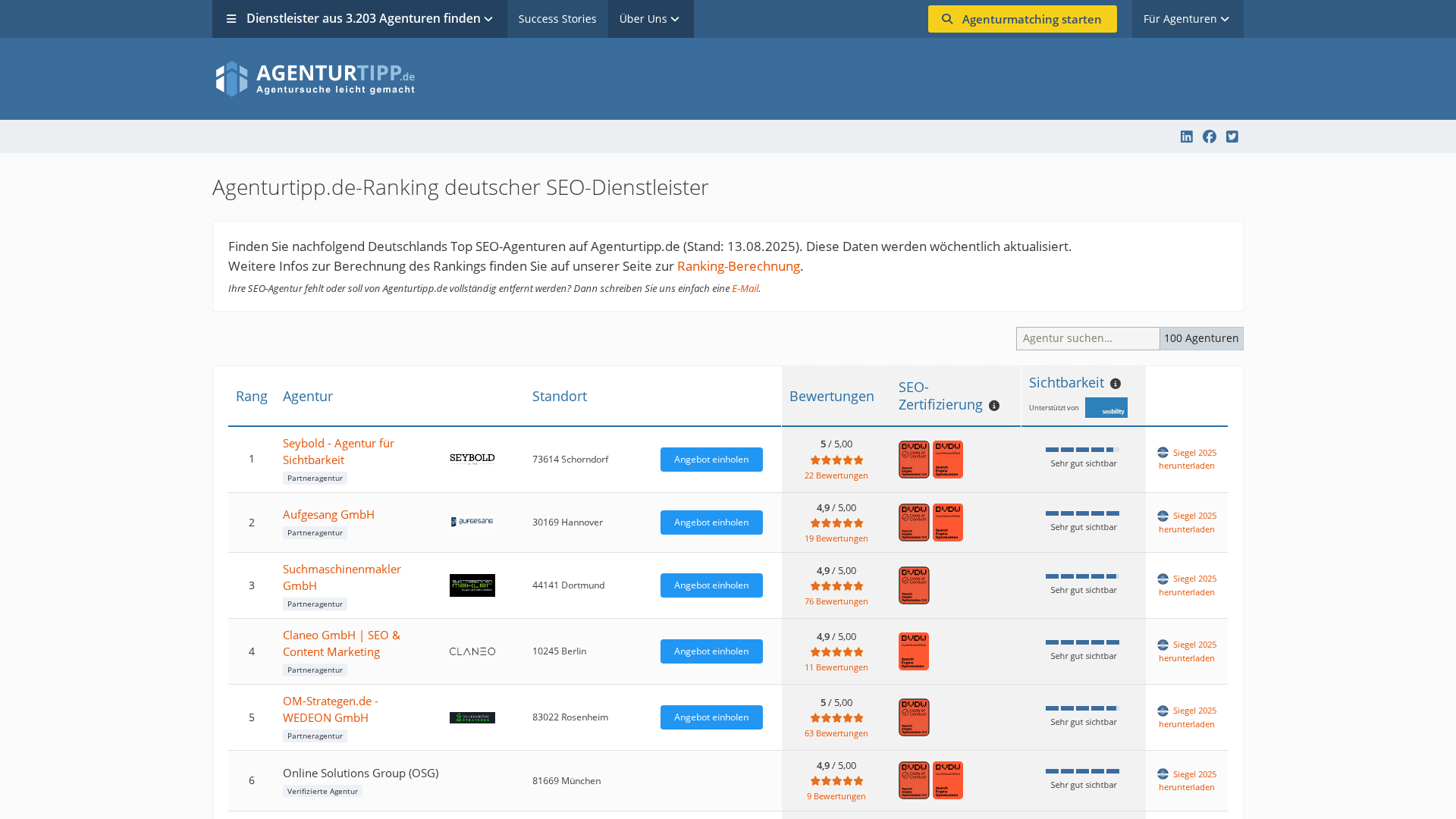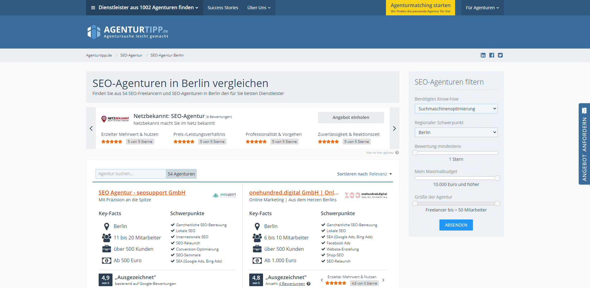 Agenturranking: Agentursieger 2022 17. Januar 2023Das große Vergleichsportal der Agentur-Branche Agenturtipp.de (www.agenturtipp.de) hat auch in diesem Jahr wieder im Rahmen einer Studie Deutschlands SEO-Dienstleister analysiert und ein Agenturranking mit den Top 30 Agenturen (Schwerpunkt Suchmaschinenoptimierung) veröffentlicht. Als PDF herunterladen