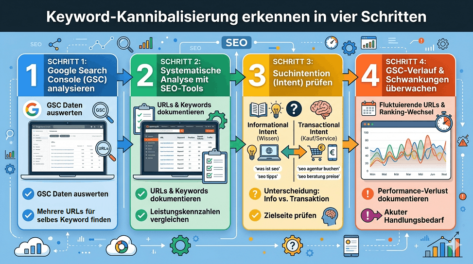 Bevor Sie eine Keyword-Kannibalisierung beheben können, müssen Sie sie zuverlässig identifizieren. Die Diagnose sollte immer vor der Therapie stehen – blinder Aktionismus führt oft zu neuen Problemen. Die folgenden vier Schritte bilden einen systematischen Prozess, den Sie mit frei verfügbaren und professionellen Tools umsetzen können.