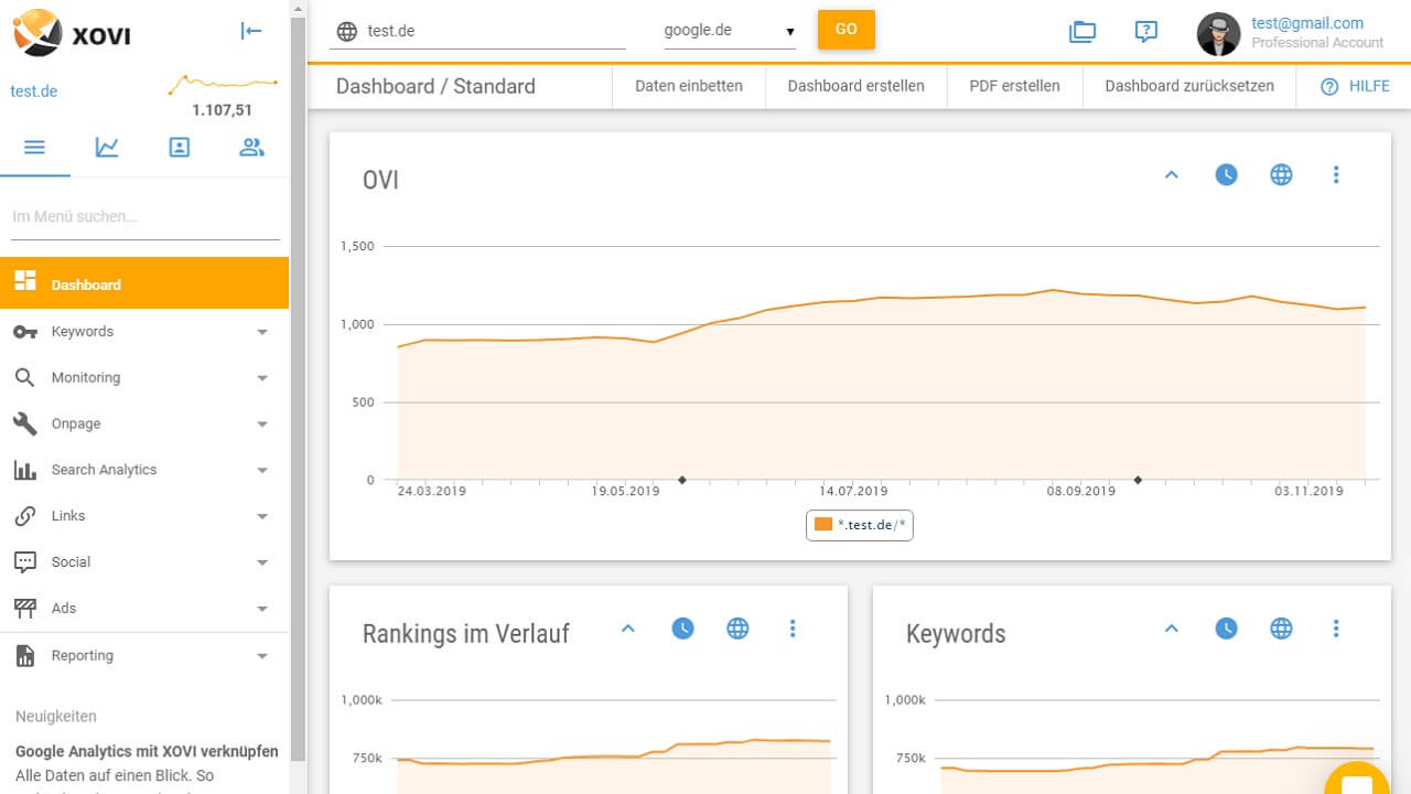 Über Search-Analytics können Sie Ihr SEO-Tool mit Ihrem Account bei Google Analytics oder der Google Search Console verknüpfen und anschließend die Daten von dort importieren. Das liefert Ihnen noch genauere Informationen zu Besucherströmen oder dem Suchvolumen für einzelne Keywords.